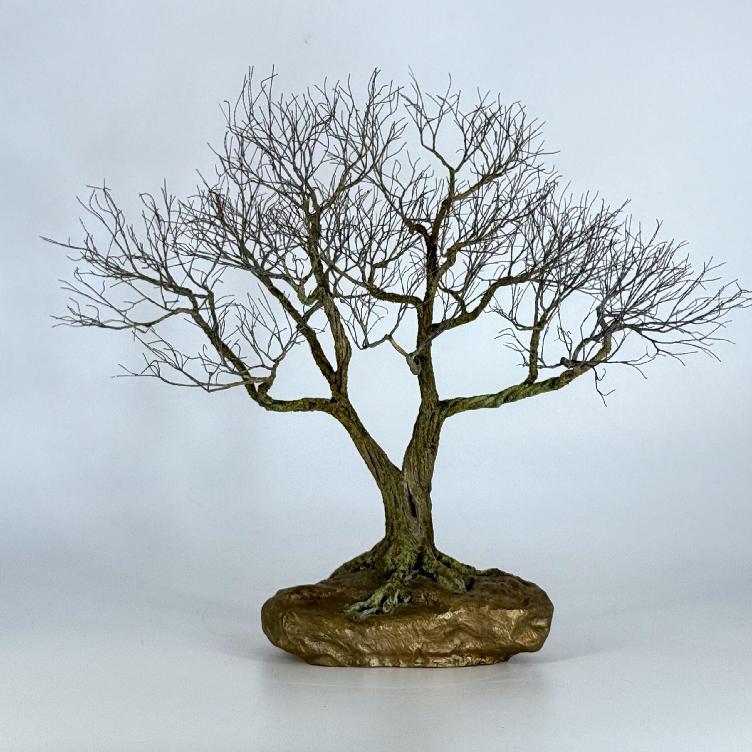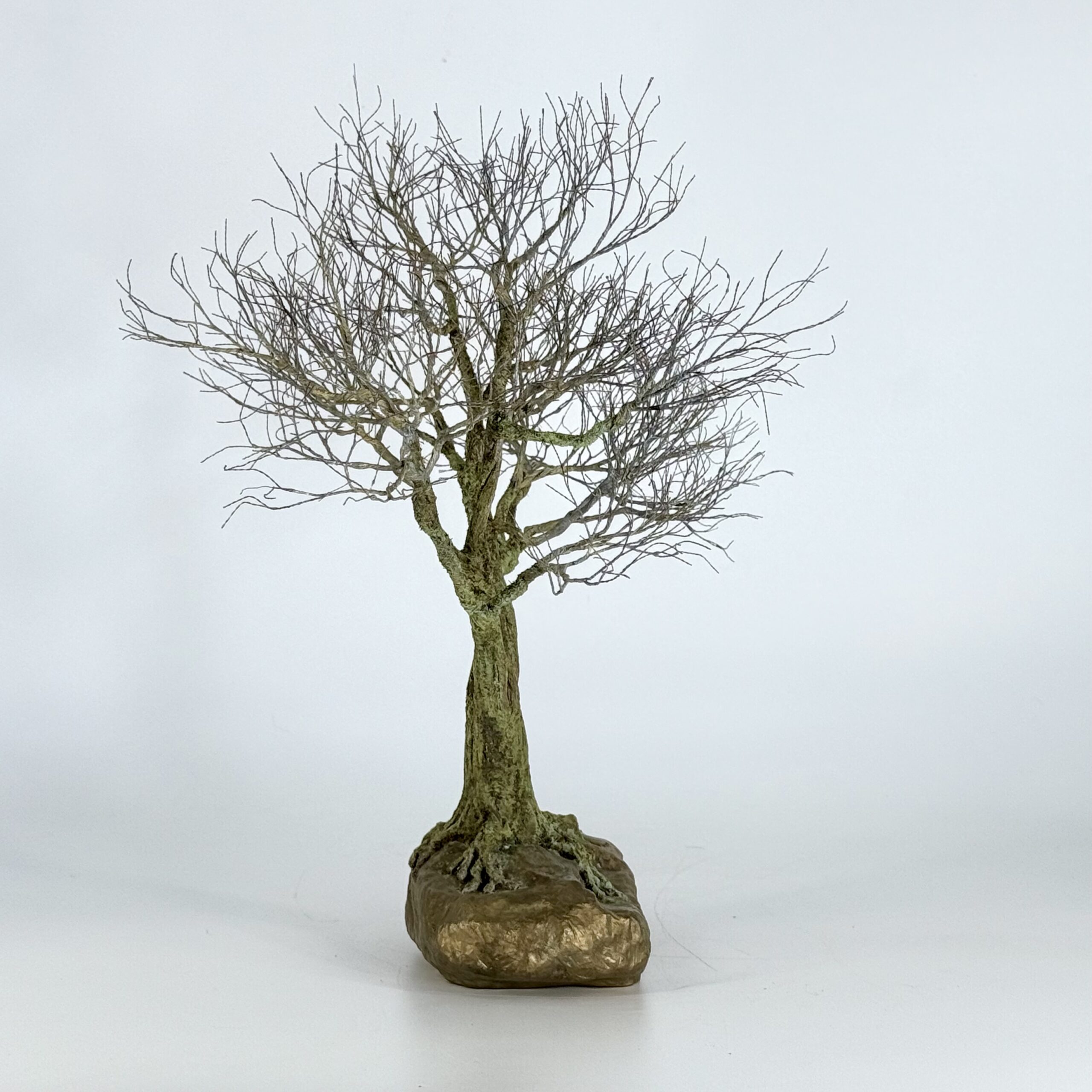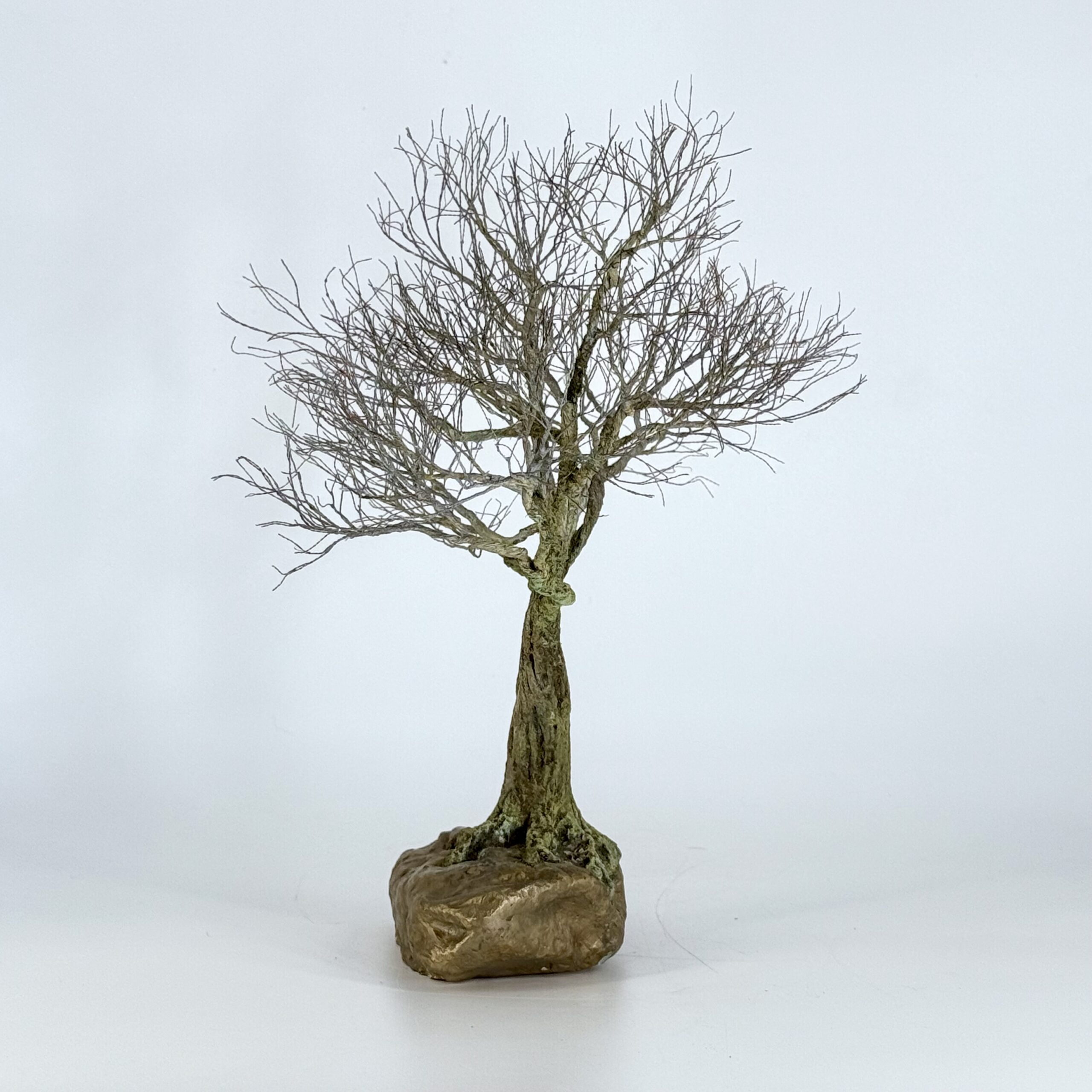 Façonnée à la main en cuivre patiné, chaque branche est méticuleusement torsadée pour créer deux couronnes distinctes mais harmonieuses. La base de bronze apporte ancrage et permanence, contrastant avec la légèreté des branches entrelacées.